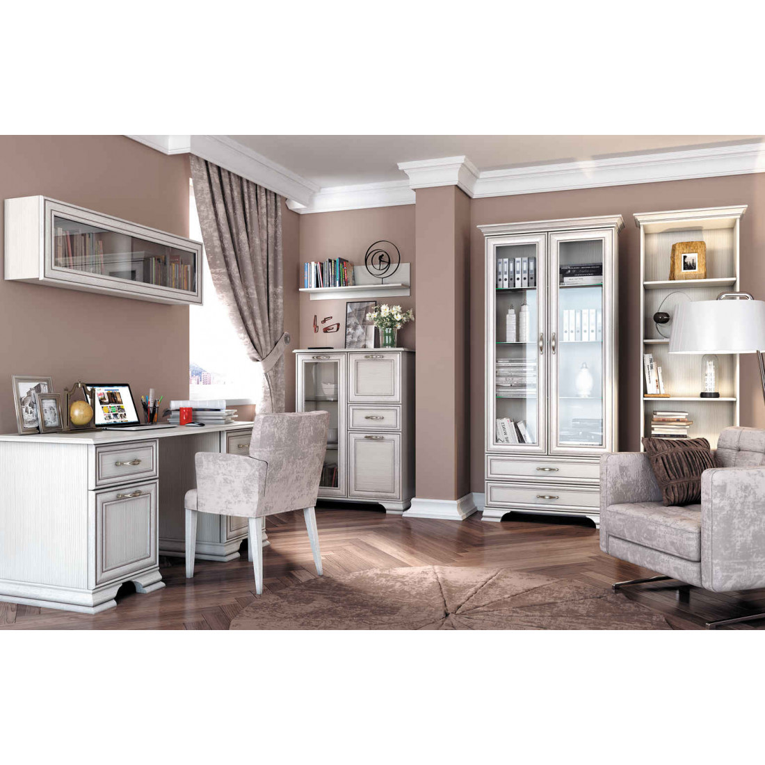 Домашний кабинет Тиффани - это классика, которая всегда остается модной и стильной. Сочетание светлого оттенка с древесной структурой, нежных фасадов, обрамленных изящными планками с патиной и качественных металлических ручек создадут атмосферу тепла и уюта, а возможность использования подсветки делает эту коллекцию особенно привлекательной. Основное достоинство TIFFANY - эстетическая функциональность, которая роскошно дополнит различный по назначению интерьер.