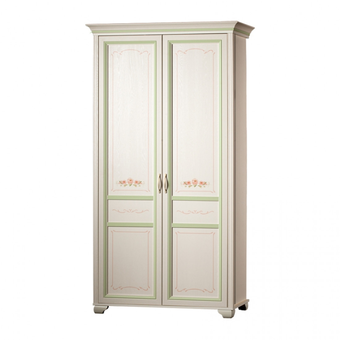 Золотистые ручки с белой патиной подчеркивают классический стиль мебели