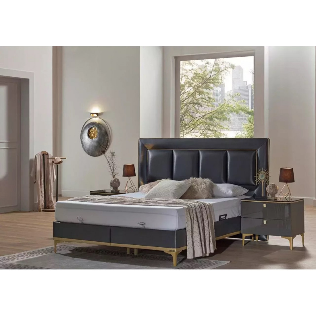 Кровать (база) без спинки CARLINO, щитовой конструкции на декоративных ножках c подъемным жестким основанием под матрас. Щитовой каркас кровати плита ЛДСП т.18мм, дно плита МДФ 6мм. Каркас обит поролоном, винилискожей двух цветов, основного цвета и в нижней части обивка винилискожа контрастного золотого цвета.  Жесткое основание кровати рамочной металлической конструкции на основе трубы профильной размером 20х30,20х20 с подъемным механизмом. Настил основания поролон т.3мм, основание обито тканью. Сборка каркаса базы на шкант, скобу металлическую, уголок пластмассовый. Подъемный механизм устанавливается при помощи винтов и винтов с гайками. Ножки кровати пластмассовые, четыре ножки декоративные, шесть опорных круглых ножек, ввинчивающихся для двойных баз. На дно базы устанавливается аэратор пластмассовый с логотипом Bellona для    кондиционирования воздуха. Ручка -держатель для подъемного основания металлическая.