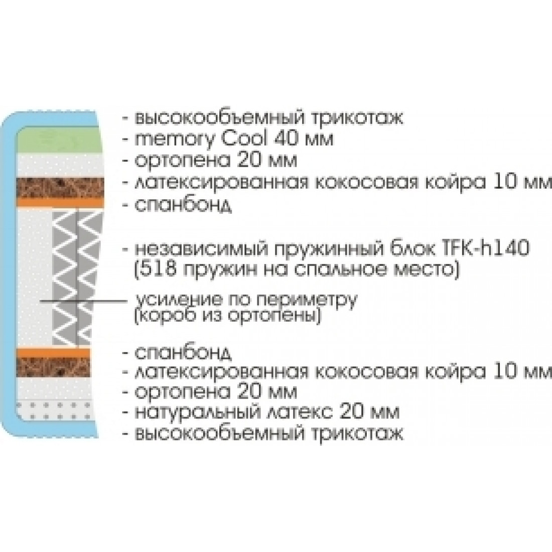 Наполнение: Memory Cool 40 мм, ортопена 20 мм, натуральный латекс 20 мм, латексированная кокосовая койра 10 мм, спанбонд, блок независимых пружин, усиление матраса по периметру.