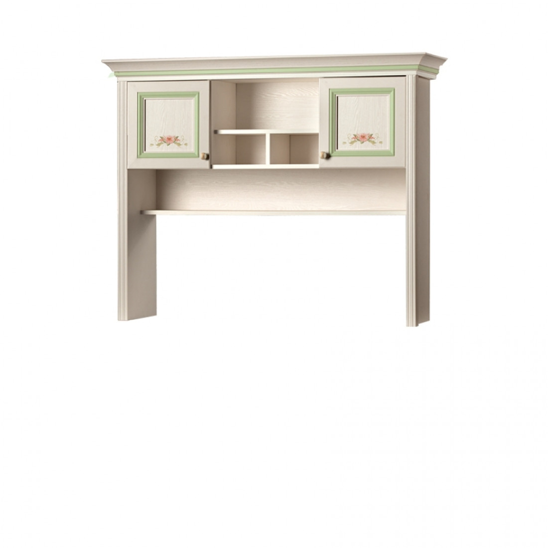 Золотистые ручки с белой патиной подчеркивают классический стиль мебели