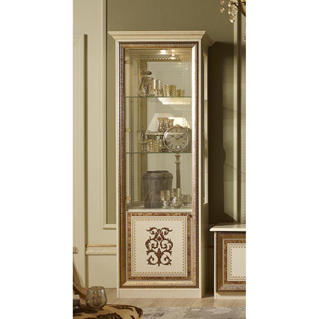 Шкаф-витрина однодверный Анита (бежевый глянец) от Российской фабрики «ДИА мебель» Выполнена в цвете бежевый глянец с отделкой золотых фасадов. Классический стиль придают интерьеру неповторимую уникальность и роскошь. Изгибающиеся линии придают легкость и воздушность гостиной либо столовой. Коллекция "Анита" придаст вашему дому экстравагантность и принесет свежие нотки.