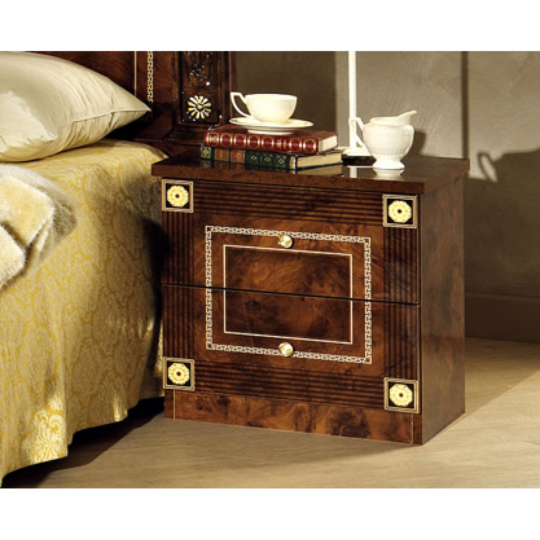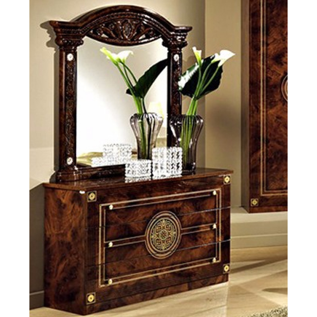 Спальня Рома (орех) композиция 2 от Российской фабрики «ДИА мебель» выполнена в строгом, классическом стиле. Ореховый цвет в сочетании с глянцевым покрытием придает элегантность. Такая спальня поможет Вам окунуться в атмосферу роскоши и комфорта. Большой шестистворчатый шкаф поможет с пользой заполнить место. Безшумные и плавно закрывающиеся дверцы шкафа и комода помогут с легкостью забыть о шуме по утрам. Вся коллекция "Рома" предназначена только для истинных ценителей элегантного классического стиля.