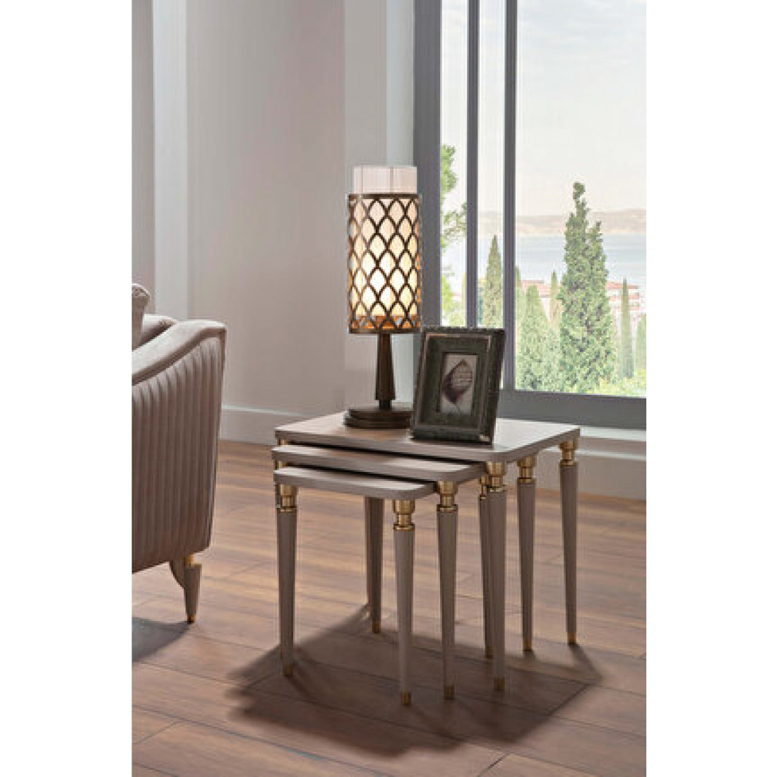 Стол журнальный Санвито SANV-52 это оригинальное дизайнерское решение от турецкого бренда Bellona. Три журнальных столика собираются в одну небольшую композицию. Экономия пространства с одной стороны, и возможность размещения нескольки столиков в разных частях дома,с другой. Столики имеют разные габаритные размеры :1) 620х400х490 мм 2) 490х400х460 мм 3) 370х400х430 мм. Выполнены в традиционных кремовых тонах с использованием золотистой оттделки. Эффектные, компактные , просто шедевр мебельного искусства.