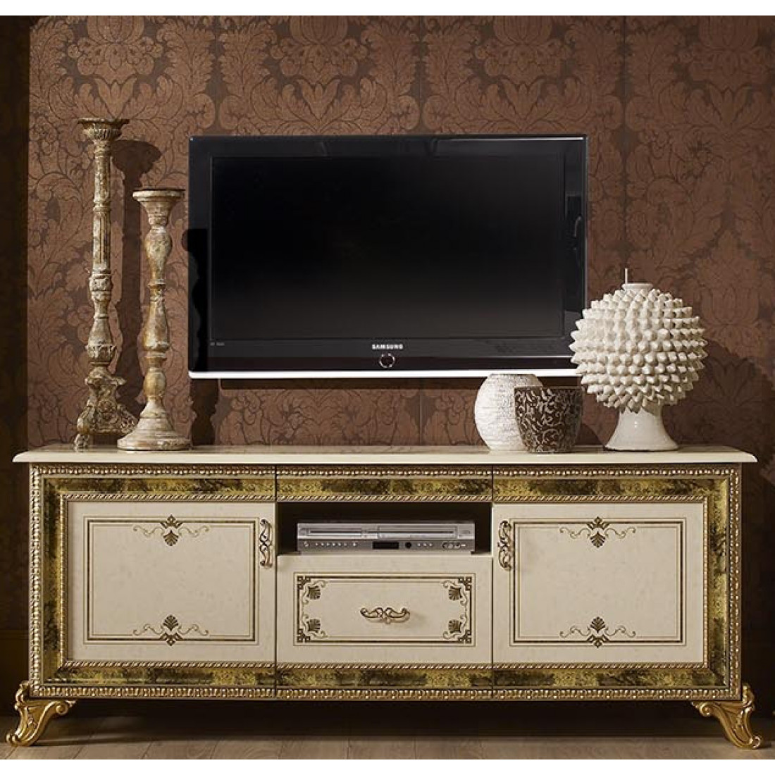Тумба под телевизор Катя - выполнена в классическом стиле от Российской фабрики "ДИА мебель". Выполнена в бежевом цвете с элементами позолоты на фасаде. Аккуратные и элегантные ручки придадут атмосферу богатства. Такая тумба не займет много места и будет просто незаменимым модулем для вашей гостиной.