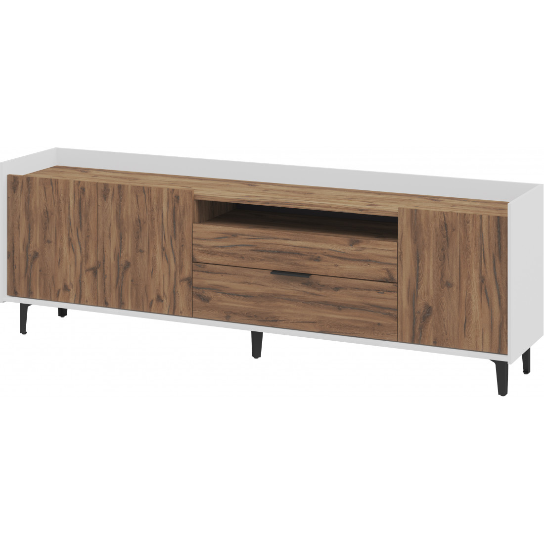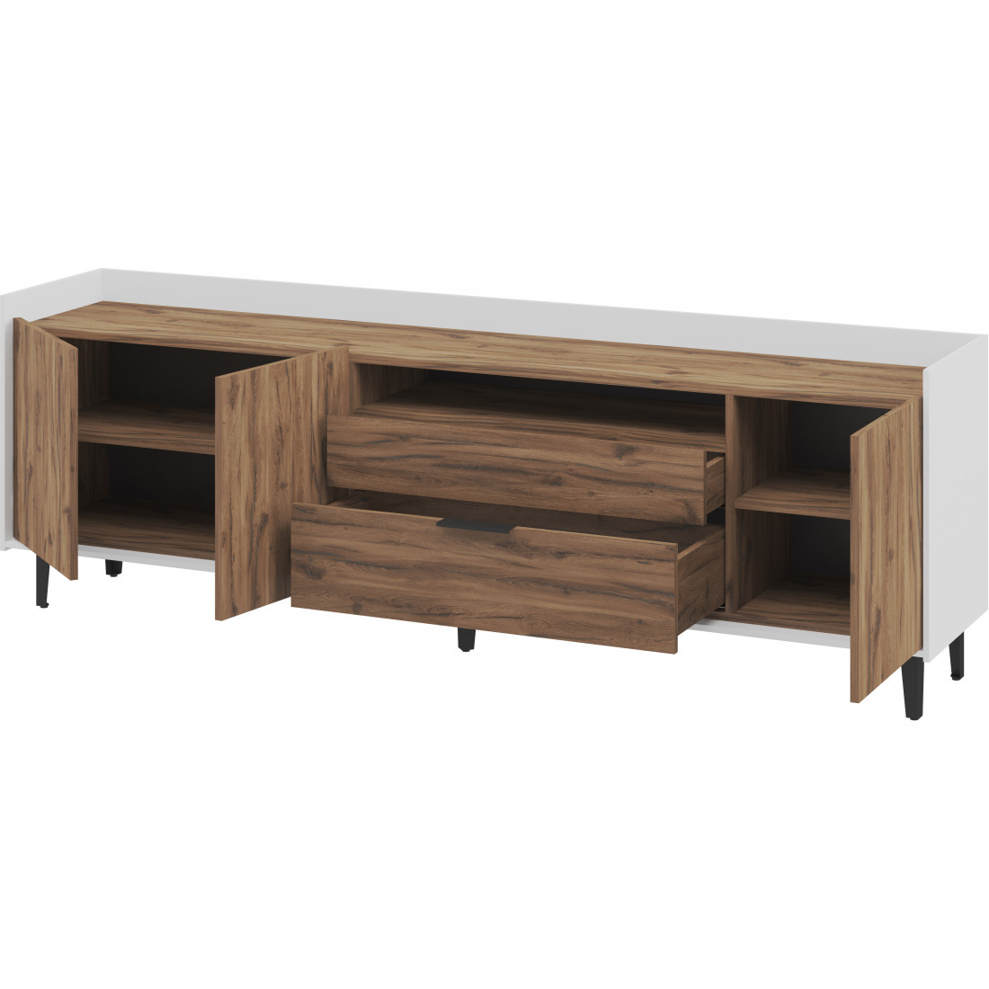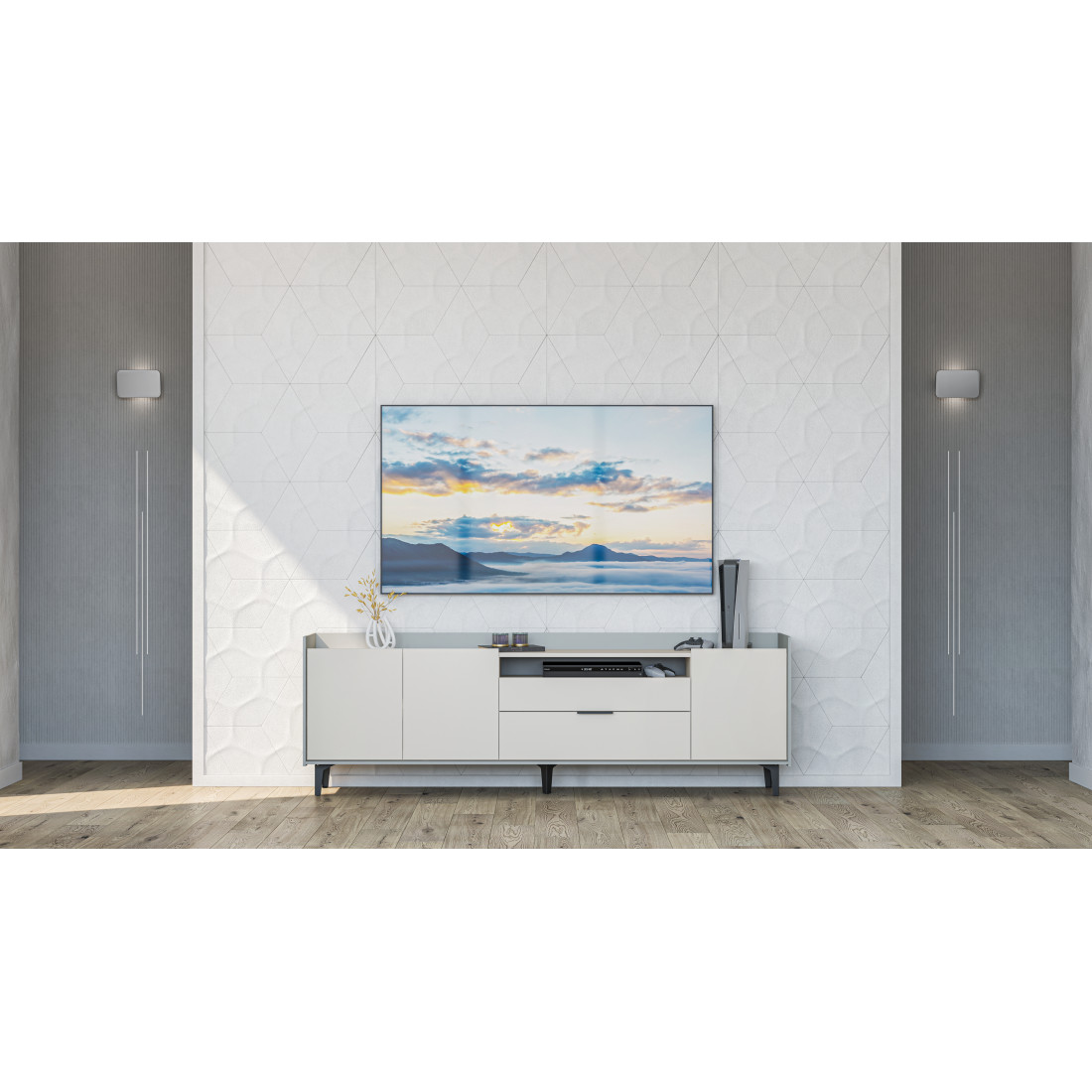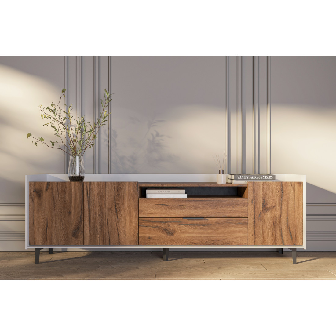 Элегантная тумба под ТВ Модена станет идеальным дополнением для вашей гостиной. Выберите из трех стильных вариантов цветов: Белый-Дуб Элисон, Лунный камень-жемчуг, Металл Бруклин-лунный жемчуг. Ножки из металла обеспечивают устойчивость. Длинная тумба предлагает два отделения с полками для размещения аудио- и видеоаппаратуры, а также одно отделение с двумя удобными ящиками. Над ящиками расположена ниша для мелочей. Эта тумба сочетает в себе функциональность и стиль, делая ее идеальным решением для вашего медиацентра в гостиной