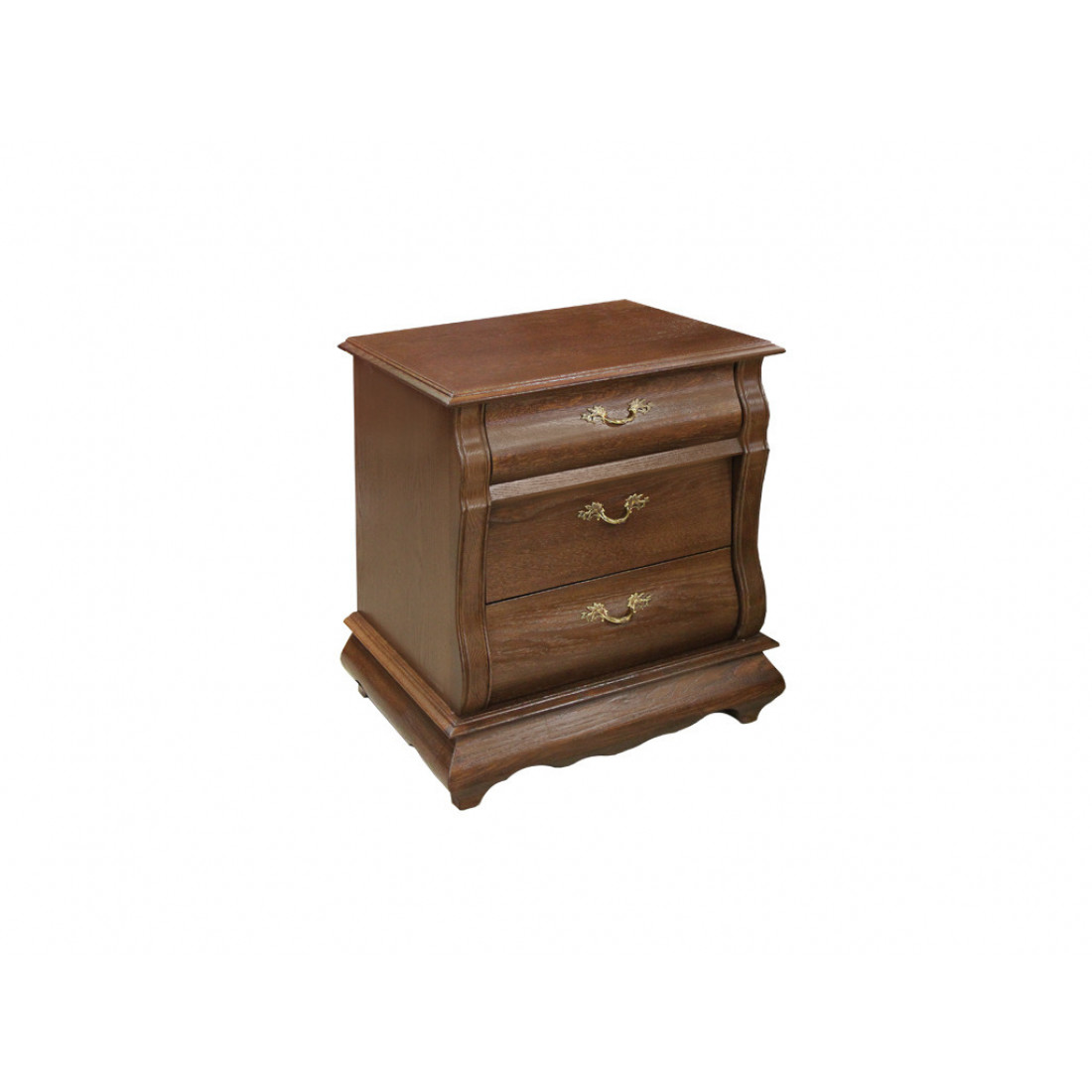 Прикроватная тумба с выдвижными ящиками входит в коллекцию мебели для спальни "Оскар" и имеет ее характерные стилистические особенности - оригинальную выгнутую форму фасада. Здесь нет флоральной резьбы, но растительный мотив прослеживается в фурнитуре ящиков. Модель выполнена из массива дуба и окарашена в классический оттенок "Орех".
